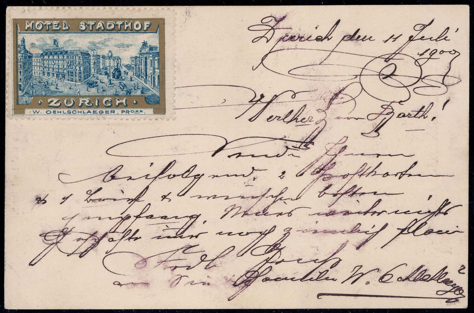 Hotel Stadthof (Hotelmarke) Entdeckung einer neuen Karte mit dieser Hotelmarke: Karte vom 11. Juli 1900 mit Unterschrift des Hoteliers W. Oehlschlaeger. Damit sind jetzt ein Verwendung 1899 und 1900 belegt. (Siehe Datenbank Id 592) - Quelle: Auktion Pilatusmail.ch April 2022